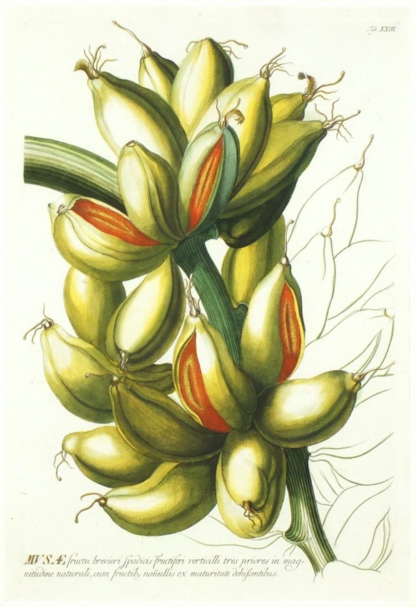 Banány. "Musae fructu breviori ...". Původní, staře kolorovaná mědirytina, Ch. J. Trew, 'Plantae Selectae', 1752. 43:28,5 cm.