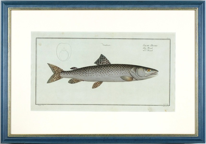 Hlavatka obecná. "Salmo Hucho. Der Heuch. Le Heuch". Původní, staře kolorovaná mědirytina, M. E. Bloch, 1784. Podle Krügerovy kresby ryl Bodenehr. 18,5:37 cm.