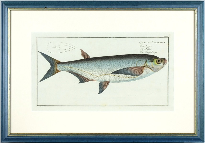 Ostrucha křivočará. "Cyprinus Cultratus. Die Ziege. Le Rasoir. The Knife-Carp". Původní, staře kolorovaná mědirytina podle Krügerovy kresby, M. E. Bloch, 1784. 19:36,5 cm.