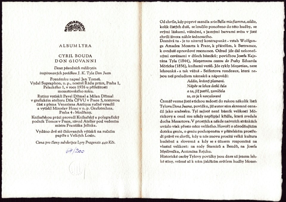 Bouda, Cyril. "Cyril Bouda, Don Giovanni, 10 mědirytin". Praha: Lyra Pragensis, 1976. 10 původních, tužkou signovaných mědirytin (každá 7:5,5 cm), dvoulist doprovodného textu. Výtisk čís. 64/200. Tištěno na silných ručních papírech o rozměru 15:10,5 cm. Volné archy v původních deskách zlaceným titulem na hřbetu.