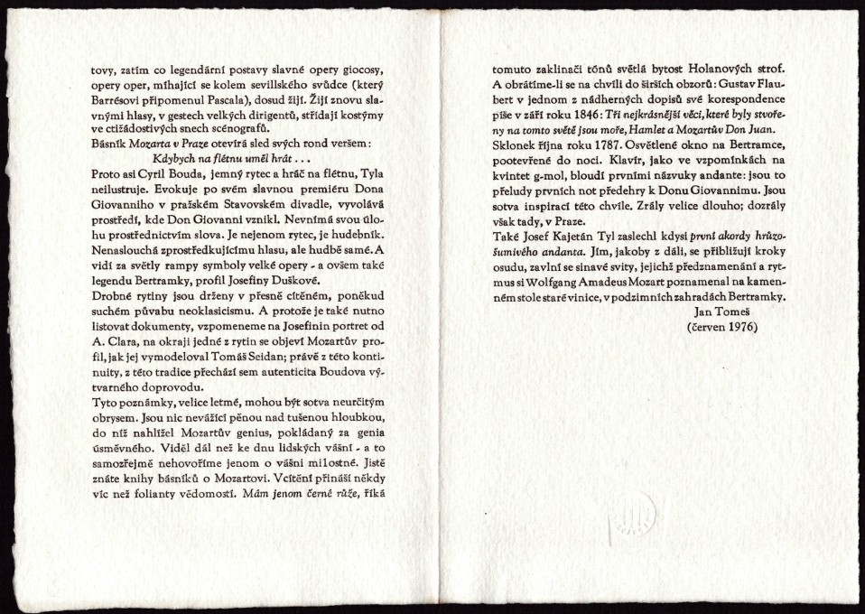 Bouda, Cyril. "Cyril Bouda, Don Giovanni, 10 mědirytin". Praha: Lyra Pragensis, 1976. 10 původních, tužkou sign. mědirytin (každá 7:5,5 cm), dvoulist doprovodného textu. Výtisk čís. 64/200. Tištěno na silných ručních papíre o rozměru 15:10,5 cm. Volné archy v původních deskách.