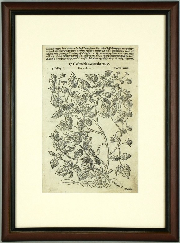 Mattioli, Pietro Andrea (1501-1577). Maliny. "Maliny. Rubus Idaeus. Bocks beeren". Původní dřevořez z 1. českého vyd. Mattioliho Herbáře ("Herbář neboli bylinář"). Vyd. J. Melantrich z Aventina v Praze, 1562. 27,5:17,5 cm (výřez pasparty).