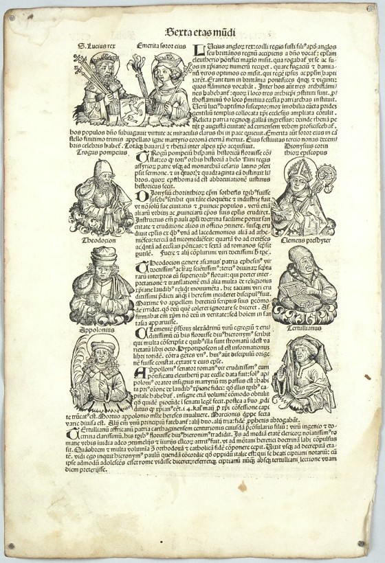 Schedel, Hartmann (1440-1514). "Folium CXV". List z Schedelovy Liber Chronicarum (Norimberská kronika). Vydal A. Koberger v Norimberku, 1493. S celkem 11 dřevořezy od M. Wolgemuta (římští císařové Commodus, Pertinax, Didius Julianus a Septimius Severus přední straně; Luzius z Churu, jeho sestra Emerita, Pompeius Trogus, Theodotion, sv. Apollonius, sv. Dionysius Korintský, Kléméns Alexandrijský a Tertullianus na rubové straně). 46,5:31 cm.