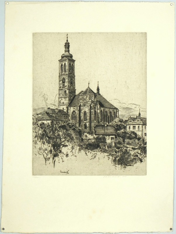 Vondrouš, Jan Charles. "Sv. Jakub v Kutné Hoře". Původní lept, 1940. Typo. signováno a datováno v desce dole a tužkou sign., dat. a číslováno (104/200) pod deskou. 32:25,5 cm na silném japanu o rozměrech 51,5:38 cm.