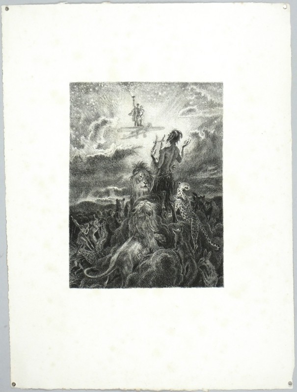 Švabinský, Max. "Satyr předpovítá vzlet člověka do vesmíru". Původní litografie, 1945. 27,5:20,5 cm na velkém formátu italského ručního papíru o rozměrech 51:38 cm se zřetelným vodoznakem ('P_M Fabriano, Umbria, Italia') - mimo náklad 70 ks..