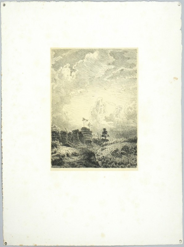 Švabinský, Max. "Turnovská krajina". Původní litografie s podtiskem, 1945. 25:18 cm (žlutý podtisk 25,8:18,5 cm) na italském ručním papíře o rozměrech 51:38 cm.