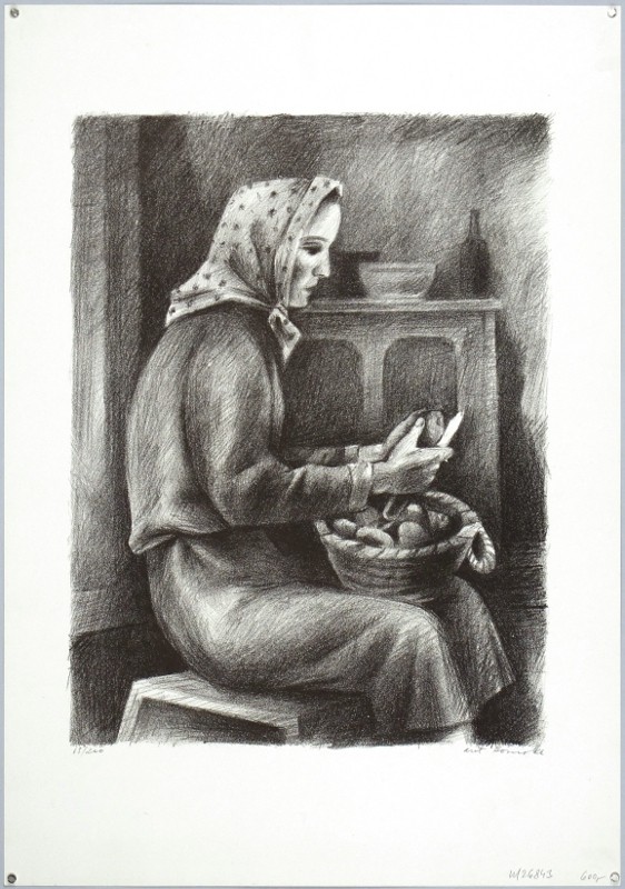 Homolka, Antonín. Žena škrábající brambory. Původní litografie, ca. 1945. Signováno a číslováno (63/200) tužkou pod deskou. 36:27 cm.
