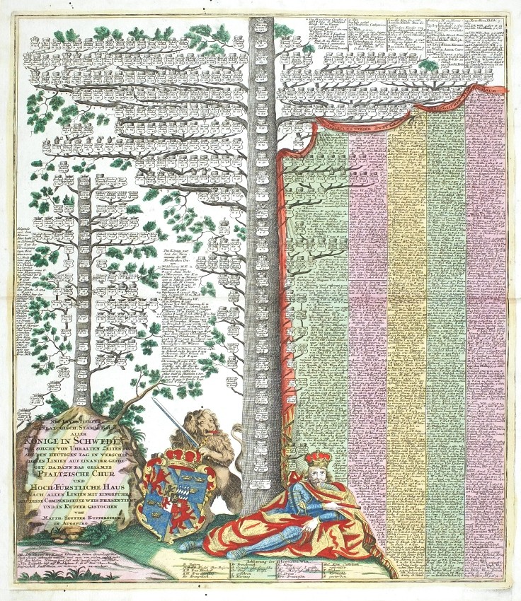 Švédšdí panovníci (rozrod). "Neu Inventierter Genealogisch. Stamm Baum aller Könige in Schweden wie solche von Uhralten Zeiten bis auf den heütigen Tag in verschiedenen Linien auf einander gefolget, da dann das gesamte Pfaltzische Chur und Hoch-Fürstliche Haus, nach allen Linien mit eingeführt auf diese Compedieuse weis praesentiert und in Kupfer gestochen". Původní, staře kolorovaný mědiryt, M. Seutter, Augsburg, ca. 1730. Rozrod švédských králů. S figurou (švédský král), švédským lvem a erbem. 57:49 cm.