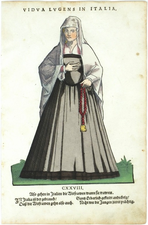 Jost Amman. "Vidua Lugens in Italia. Also gehen in Italien die Witfrawen wann sie trawren". Původní dřevořez, J. Amman z 1. vyd. jeho 'Habitus praecipuorum populorum ... Trachtenbuch darin fast allerley und der furnembsten Nationen die heutigs tags bekandt sein'. Vyd. H. Weigel v Norimberku, 1577. Skvostné původní kolorování. 23:17 cm na papíře o rozměrech 30,5:20 cm.