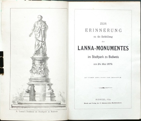 České Budějovice. Adalbert Lanna. "Zur Erinnerung an die Enthüllung des Lanna-Monumentes im Stadtpark zu Budweis am 24. Mai 1879". České Budějovice: Zdarssa, 1879. 8°. OBrož.