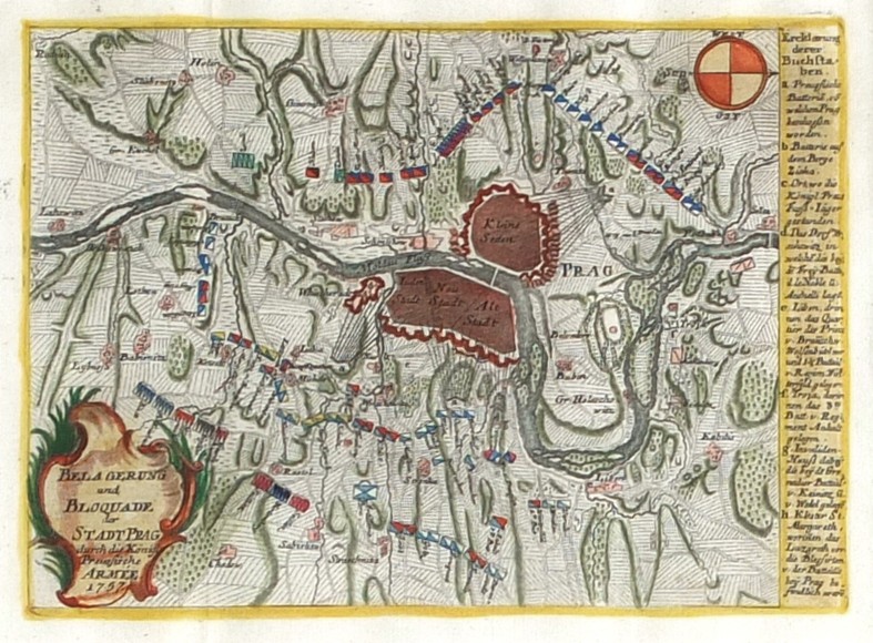 Praha (obléhání 1757). "Belagerung und Bloquade der Stadt Prag durch die Königl. Preussische Armée 1757". Pův., kolorovaný mědiryt. Vydal C. Wendler v Lipsku, 1757. S dekorativní tit. kartuší a vysvětlivkami (a.-h.). 17,5:25 cm.