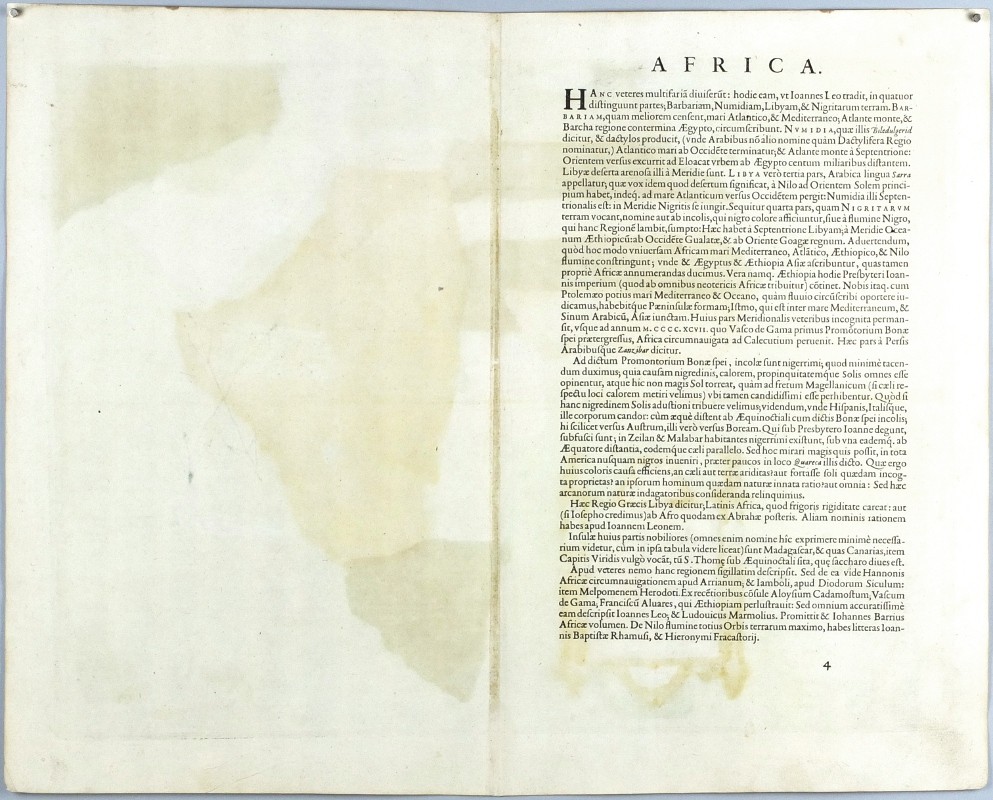 V. d. Broecke 8.1 - První stav, s datovaním v kartuši; Norwich 10; Koeman III, map 8600:31, ed. 31:001 (1570 Latin). Velmi dekorativní mapa Afriky.