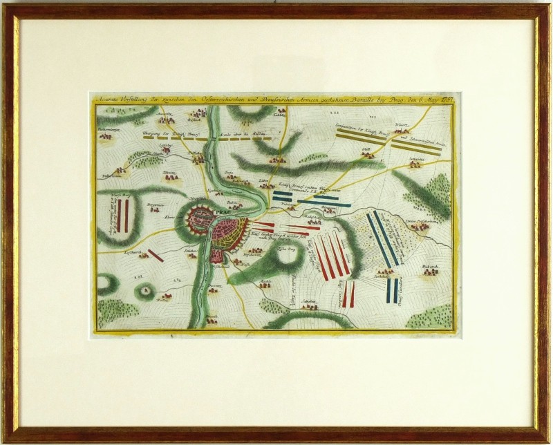Praha - obléhání 1757. "Accurate Vorstellung der zwischen den Oesterreichischen und Preusischen Armeen geschehen Bataille bey Prag, den 6. May 1757". Původní, staře kolorovaný mědiryt, G. N. Raspe, Norimberk, ca. 1760. S německým titulem nad mapou. 19,5:29,5 cm.
