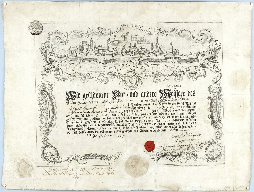 Brno - tovaryšský list cechu bednářského. "Wir geschworne Vor- und andere Meistere des Handwerks deren (Holz ?) Binder ... bescheinigen hiermit, daß Gesell Namens Johanneß Jankowski (z Blatné?) ... 20 Jahre alt ... bey uns ... 9 Wochen in Arbeit gestanden ... Geben ... 1781". Původní mědirytina, ca. 1770. Vyplněný tovaryšský list s celkovým pohledem na Brno v ornamentálním rámci s moravským zemským erbem. Se dvěma suchými pečetěmi, jednou voskovou a razítkem. 26,5:34,5 cm.