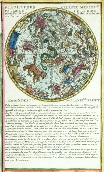 Armilární sféra, hvězdná obloha, planety. "La Sphere Artificielle ou Armilaire oblique, Elevée sur l'Horizon a la Latitude de Paris". Původní, staře kolorovaná mědirytina, L. Ch. Desnos, Paříž, 1766. Armilární sféra na dekorativním podstavci obklopená m.j. vyobrazeními slunce, měsíce a diagramy s kosmologickými teoriemi (Koperník, de Brahe, Ptolemaios, Descartes), titulní kartuší uprostřed, nad ní vyobrazení 4 planet Sluneční soustavy (Mars, Jupiter, Saturn, Venuše), po stranách vyobrazení severní a jižní hvězdné oblohy a západní a východní zemské polokoule. Vše doprovozeno francouzskými vysvětlivkami. 44:67,5 cm.