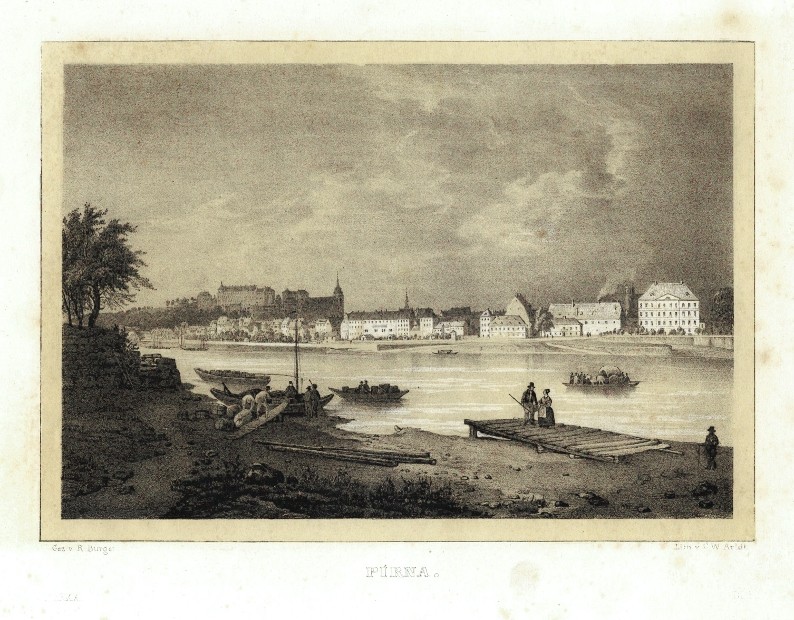 Pirna. "Pirna". Původní tónovaná litografie s podtiskem. Podle R. Bürgerovy kresby litografoval C. W. Arldt. Z: C. G. Semmler - 'Der Elbstrom, von seinem Ursprunge bis zu seiner Mündung in die Nordsee ...'. Drážďany: Semmler, 1845. S figurami a čluny na Labi v popředí a lito. titulem pod obrázkem. 18:24 cm.
