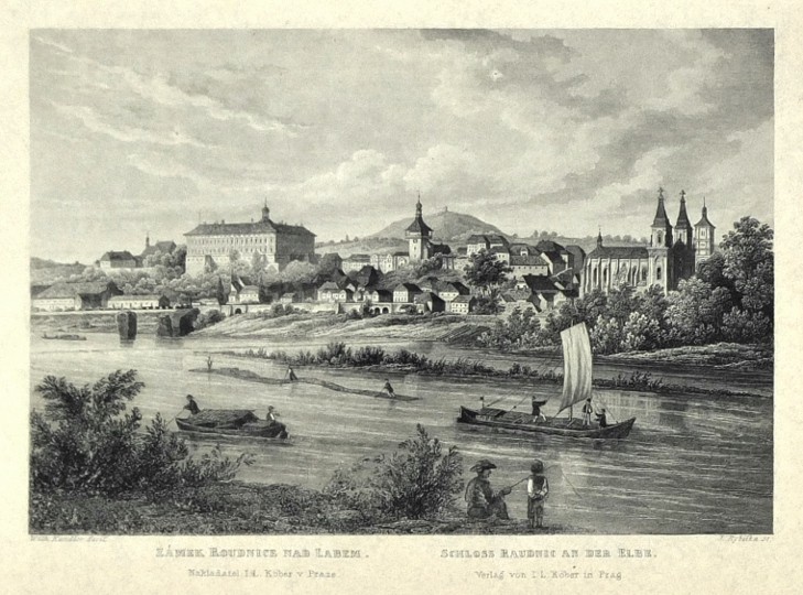 Roudnice nad Labem. "Zámek Roudnice nad Labem. Schloss Raudnic an der Elbe". Původní ocelorytina. Podle W. Kandlerovy kresby ryl J. Rybička, vydal I. L. Kober v Praze, 1865. Se čluny na řece v popředí a česko-něm. titulem pod obrázkem. 13:18,5 cm (obrázek).