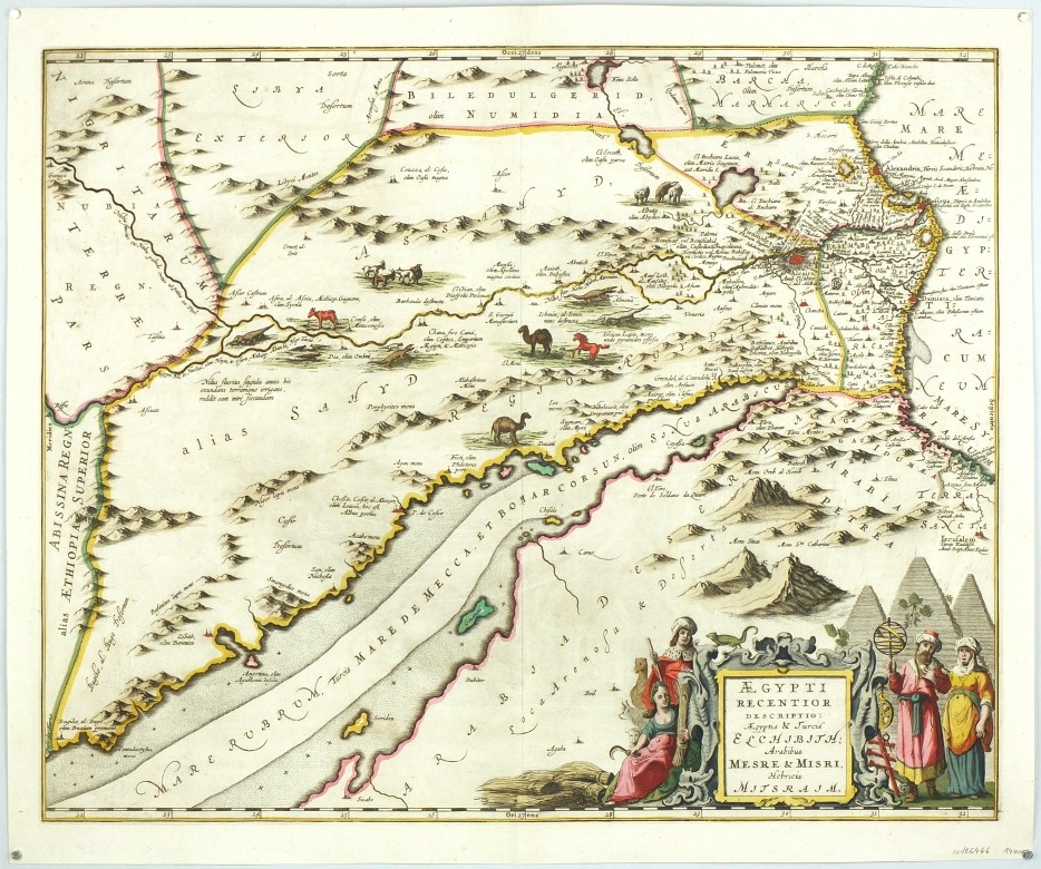 Egypt. "Aegypti Recentior Descriptio: Aegyptis & Turcis Elchibith; Arabibus Mesre & Misri, Hebraeis Mitsraim". Původní, staře kolorovaná mědirytina, J. Janssonius, Amsterdam, ca. 1650. S velkou figurální titulní kartuší s pyramidama v pozadí, několika zvířaty v mapě. 40:50 cm na papíře o rozměrach 45:54 cm.