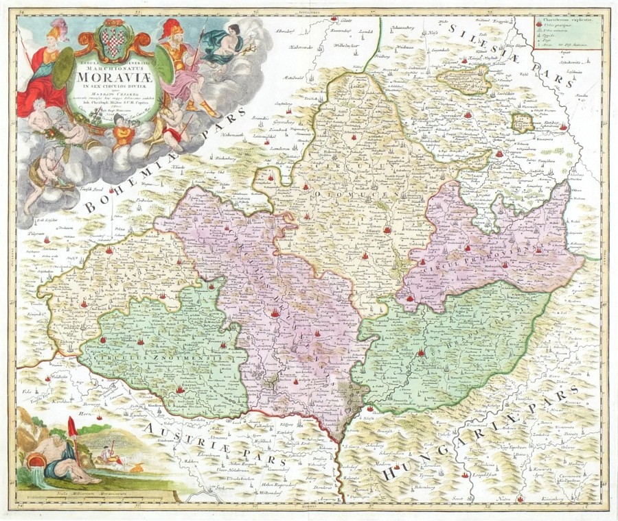 Morava. "Tabula Generalis Marchionatus Moraviae in sex circulos divisae". Pův. kolorovaná mědirytina podle J. Ch. Müllerovy mapy Moravy. Vyd. J. B. Homann v Norimberku, ca. 1720. S velkou figurální kartuší s erbem. 48,5:58,5 cm.