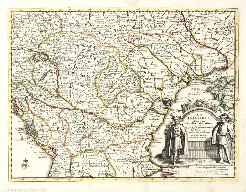 Východní Evropa. "La Hongrie". Původní, staře kolorovaná mědirytina, Covens & Mortier, Amsterdam, ca. 1730. S figurální titulní kartuší. 22,5:29,5 cm.