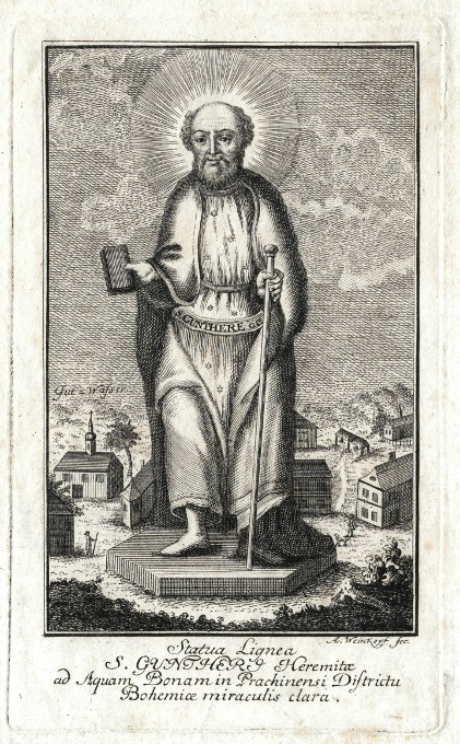 Sv. Vintíř - Dobrá Voda - Šumava. "Statua lignea S. Guntheri Heremitae ad Aquam Bonám in Prachinensi Districtu Bohemiae miraculis clara". Původní mědirytina A. von Weinkopf, 'Thesaurus absconditus in agro seu Monasterio Brzevwnoviensi prope Pragam … S. Guntheus … cognatus', Brno, 1762. S titulem pod obrázkem. 16:10 (obrázek) na papíře o rozměrech 23,5:16 cm.