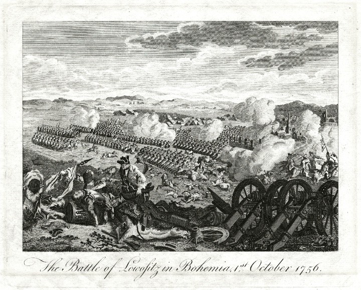 Dobové vyobrazení Bitvy u Lovosic 1. října 1756 - prvního velkého střetnutím sedmileté války mezi pruskou a rakouskou armádou.