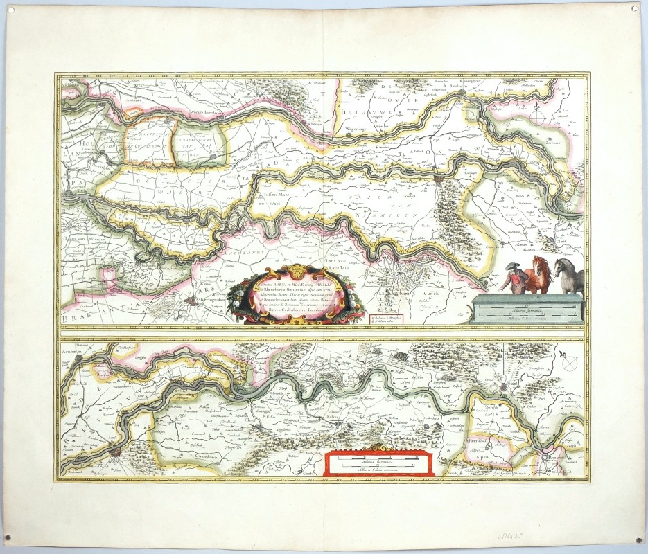 Rýn, Máza, Waal. "Tractus Rheni et Mosae totusque Vahalis". Původní, staře kolorovaná mědirytina, W. J. Blaeu, 1630. Vydal W. a J. Blaeu v Amsterdamu, 1635. S ornamentální titulní kartuší a 2 kartušemi s měřítky mapy. 38,5:50 cm na papíře o rozměrech 50,5:60 cm.