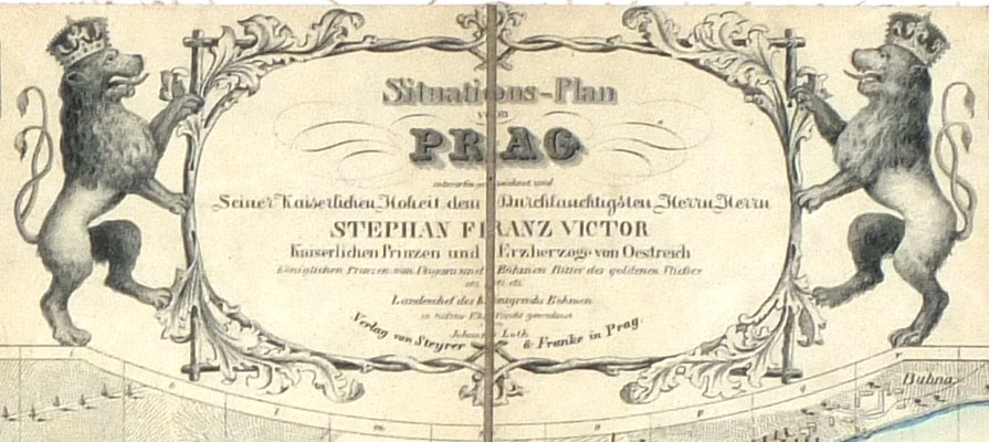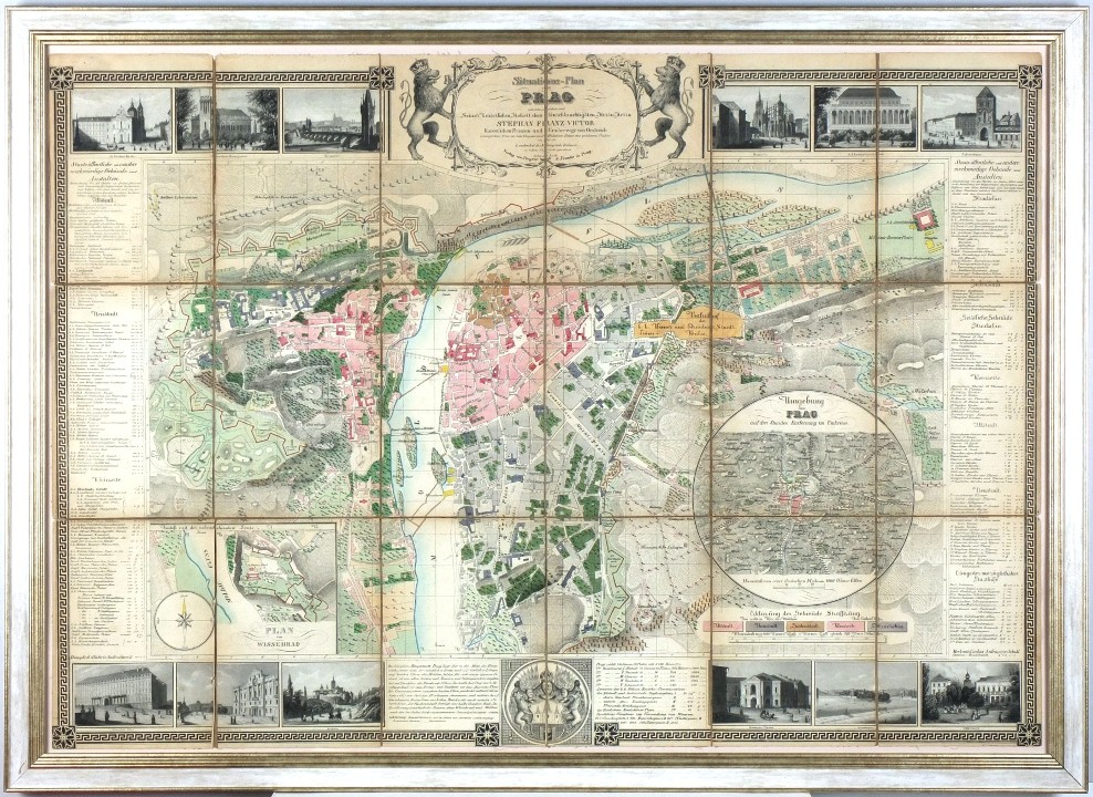 Lothův plán Prahy. "Situations-Plan von Prag". Původní staře kolorovaná litografie, J. Loth. Vyd. Steyrer a Franke v Praze, 1848. S dekorativní titulní kartuší s dvěma Českými lvy, vloženou mapkou okolí Prahy ("Umgebung von Prad"), plánkem Vyšehradu ("Plan von Wyssehrad"), pražským erbem, 12 pražskými vedutami nad a pod plánem a vysvětlivkami po stranách. 57:82 cm.