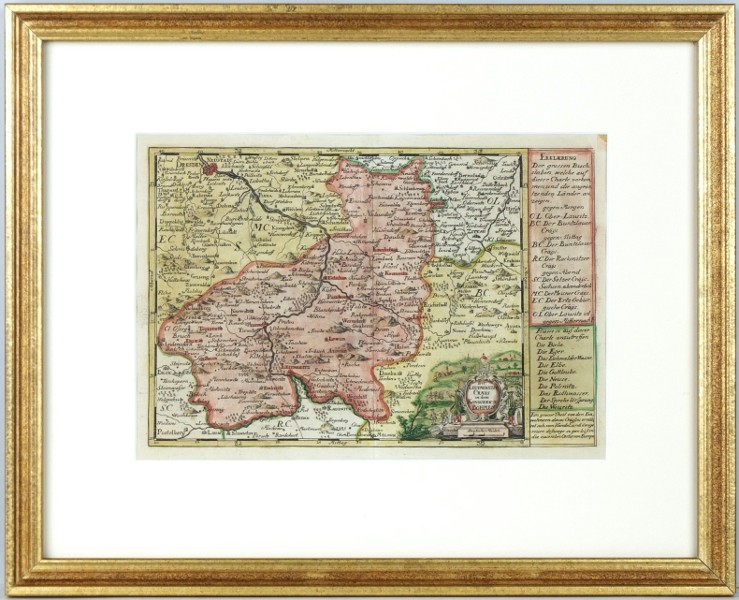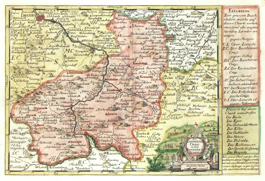 Litoměřicko. "Der Leutmeritzer Craeys in dem Konigreich Böhmen". Původní, staře kolorovaná mědirytina, J. G. Schreiber, Lipsko, ca. 1745. S figurální titulní kartuší a vysvětlivkami. 16:23,5 cm.