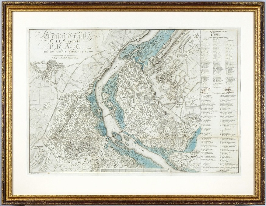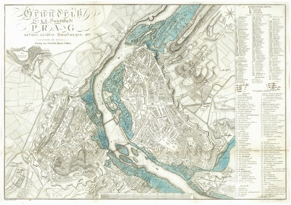 Praha. "Grundriss der k. k. Hauptstadt Prag". Pův., kol. mědrytina. Podle L. Wöllnerovy kresby ryl K. Pluth. Vyd. synové G. Haase, (1823). S rytým titulem a vysvětlivkami vpravo. 30,5:44 cm.