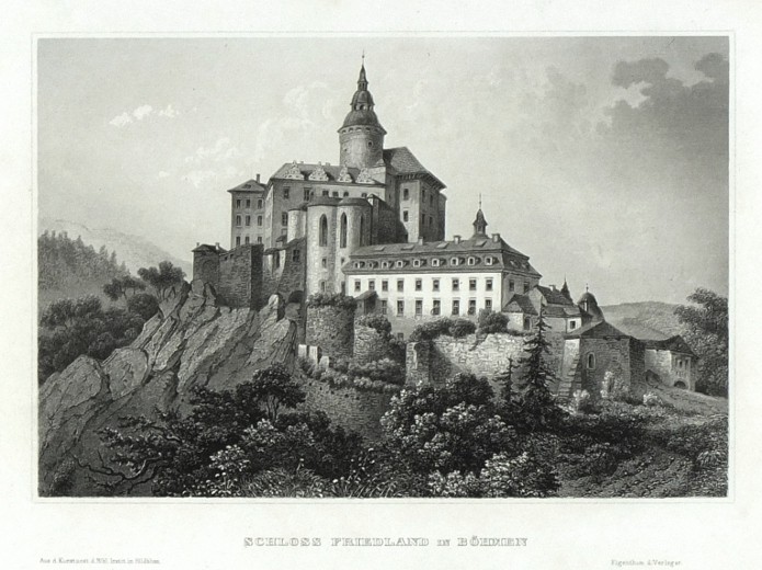 Frýdlant. "Schloss Friedland in Böhmen". Pův. ocelorytina z Meyer's Universum. Vyd. Bibliograph. Institut, Hildburghausen, ca. 1840. S něm. titulem pod obrázkem. 11:16 cm (obrázek).