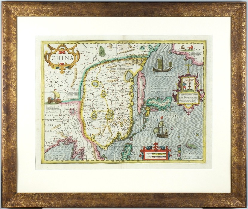 Čína. "China". Původní, staře kolorovaná mědirytina podle G. Mercatorovy mapy. Vyd. J. Janssnius a H. Hondius v Amsterdamu, 1633. S ornamentální titulní kartuší a kartuší s měřítkem mapy. 34:46 cm.