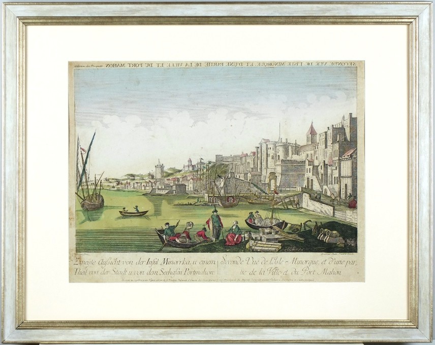 Mahón (Menorca). "Zweyte Aussicht von der Insul Minorrka, u. einem Theil von der Stadt u. von dem Seehafen Portmahon. Seconde Vue ... de la Ville et du Port Mahon". Původní, staře kolorovaná mědirytina. Podle Fontainovy kresby ryl B. F. Leizelt. Augsburk: Kaiserlich Franziskische Akademie, ca. 1780. S něm.-fr. titulem pod obrázkem. 25:38,5 cm (obrázek).
