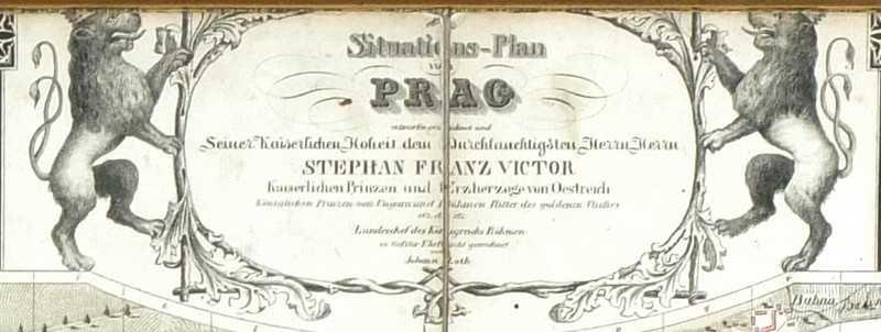 Lothův plán Prahy. "Situations-Plan von Prag". Původní staře kolorovaná litografie, J. Loth. Vyd. F. Kretzschmar v Praze, 1845. S dekorativní titulní kartuší s dvěma Českými lvy, vloženou mapkou okolí Prahy ("Umgebung von Prad"), plánkem Vyšehradu ("Plan von Wyssehrad"), pražským erbem, 12 pražskými vedutami nad a pod plánem a vysvětlivkami po stranách. 56:80 cm.
