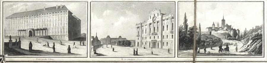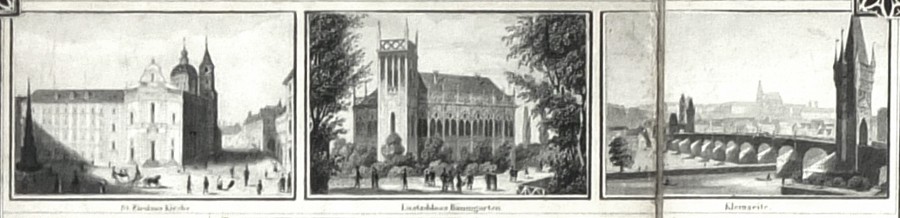 Lothův plán Prahy. "Situations-Plan von Prag". Pův., staře kolorovaná litografie, J. Loth. Vyd. F. Kretzschmar v Praze, 1845. S dekorativní tit. kart. se dvěma Českými lvy, vloženou mapkou okolí Prahy a 12 pražskými vedutami nad a pod plánem. 56:80 cm.