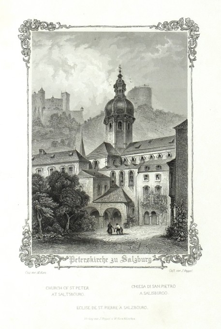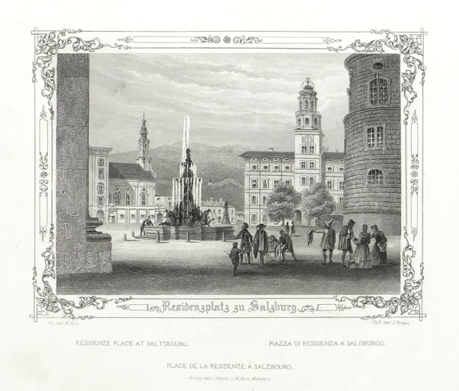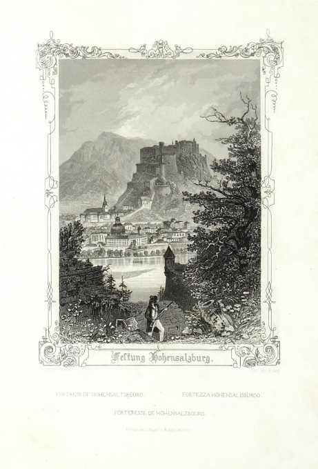 Salzburg. Poppel, J. - Kurz, M. "Salzburg und seine Umgebungen. 24 Ansichten nach der Natur gezeichnet, gestochen und herausgegeben von J. Poppel und M. Kurz. Mit erläuterndem Texte von Rudolph Löser". Mnichov: Poppel, Kurz, (1845). 8°. Titulní list, 24 ocelorytin (podle M. Kurzových kreseb ryl J. Poppel) , 62, (1) str. Text R. Löser. Původní celoplátěná vazba se zlatě raženým titulem na předních deskách.