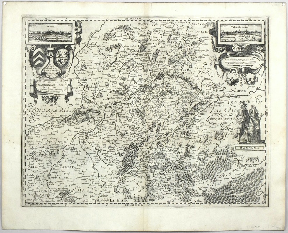 Hainaut. "Nobilis. Hannoniae Com. Descriptio". Původní mědirytina podle J. Surhonovy mapy regionu. Ryl a vydal P. van den Keere, Amsterdam, 1617. S titulní kartuší se 2 erby a celkovým pohledem na Mons (3,5:8 cm), další kartuší s měřítkem mapy a pohledem na francouzské město Valenciennes (3,5:8 cm), měřítkem mapy a 2 figurami. 37:48 cm.
