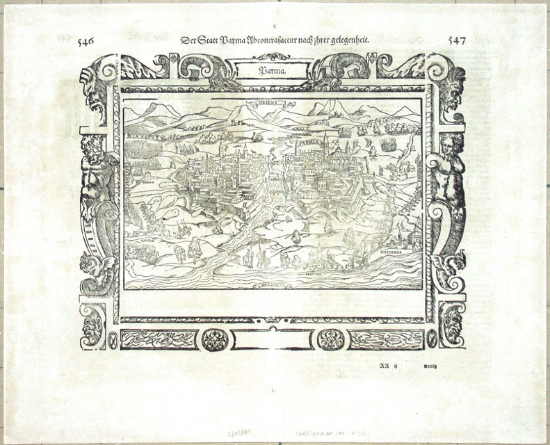 Parma. "Der Statt Parma Abcontrafactur nach ihrer gelegenheit. Parma.". Pův. dřevořez, S. Münster. Vyd. H. Petri v Basileji, 1580. Celkový pohled na město v ornamentální bordúře. 25:32,5 cm.