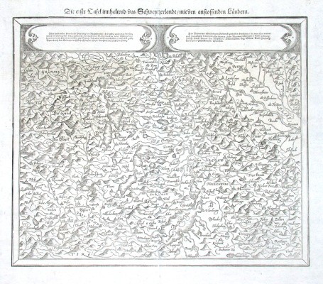 "Die erste Tafel innhaltend das Schweytzerlandt / mit den anstossenden Ländern". Orig. woodcut by S. Münster. H. Petri: Basle, ca. 1580. With German heading title and ornamental border at the top of the map. 30,5:36,5 cm (the picture only).