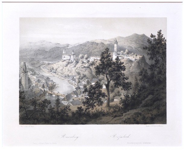 "Rosenberg. Rožmberk". Pův. dvoubarevná litografie s podtiskem od A. Hauna (1815-1894). Tiskl W. Korn v Berlíně. Vydal E. Hölzel v Olomouci, ca. 1860. Sign. "Haun" v desce. 19,5:26,5 cm.