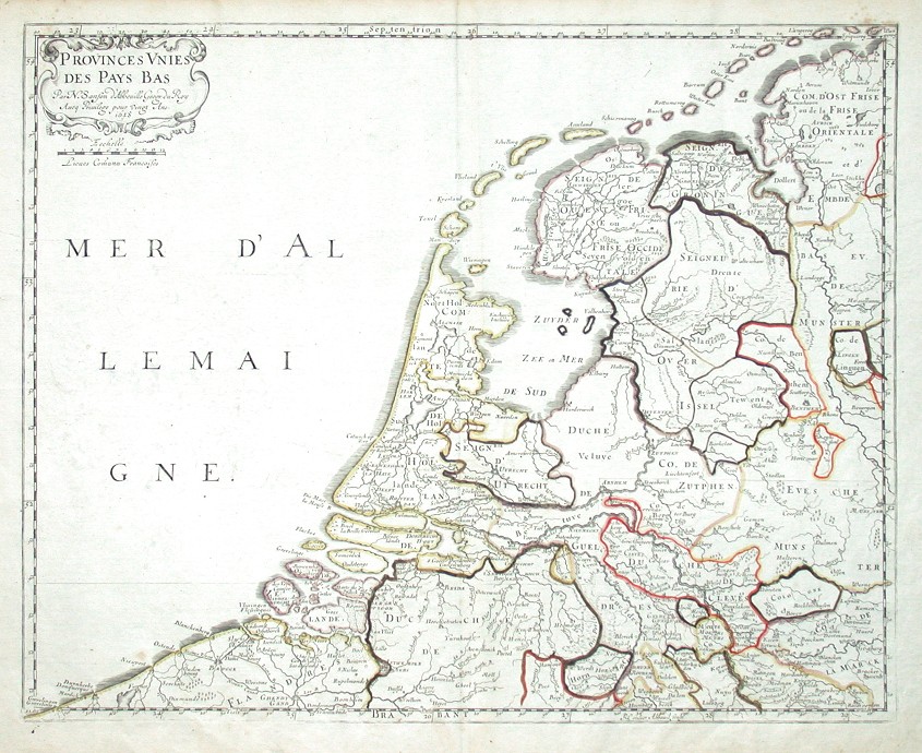 Nizozemsko. "Provinces Unies des Pays Bas". Původní, staře kolorovaná mědirytina, N. Sanson, Paříž, 1648. S ornamentální titulní kartuší s měřítkem mapy. 40,5:50 cm.