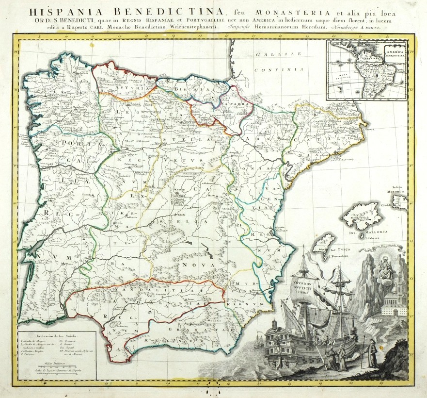 Španělsko a Portugalsko. "Hispania Benedictina, seu Monasteria et alia pia loca Ord. S. Benedicti, quae in Regnis Hispaniae et Portugalliae nec non America in hodiernum usque diem florent, in lucem edita a Ruperto Carl Monacho Benedictino Weichstephanensi". Původní, staře kolorovaná mědirytina. Vyd. Homannovi dědicové v Norimberku, 1750. S titulem nad mapou, velkou dekorativní kartuší, vloženou mapkou Jižní Ameriky ("America Benedictina") a kartuší s vysvětlivkami. 50:53,5 cm.