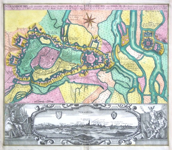 Štrasburk. "Strasbourg, ville ancienne ... - Strasburg, eine Uhralte sehr Berühmte ... Statt". Pův., staře kolorovaný mědiryt, M. Seutter, ca. 1740. Celkový pohled na Štrasburk v ornamentální bordúře se 2 erby (14:56 cm) a plán opevnění města s rytým fr.-něm. titulem a větrnou ružicí. 49:57 cm.