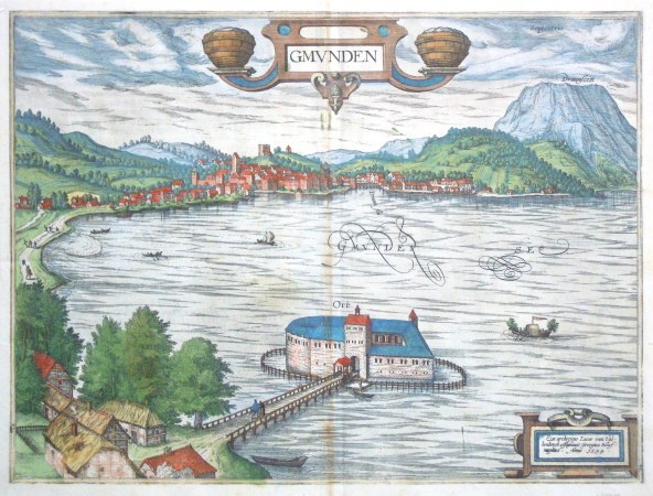 Gmunden. "Gmunden". Pův., staře kolorovaný mědiryt podle G. Hoefnagelovy předlohy z roku 1594. Z G. Braunova a F. Hogenbergova "Civitates Orbis Terarrum". Vyd. Gottfried von Kempen v Kolíně n. Rýnem, 1596. S velkou ornamentální titulní kartuší a další kartuší s datováním. 35,5:47,5 cm.