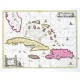 Antily. "Insularum Hispaniolae et Cubae Cum Insulis circum jacentibus accurata delineatio". Staře kolorovaný mědiryt od J. Janssonia. Vyd. G. Valk & P. Schenk, ca. 1700. S figurální titulní kartuší, ornamentální kartuší s měřítkem mapy a 2 andělíčky, větrnou růžicí a 4 loděmi. 41:52,5 cm.