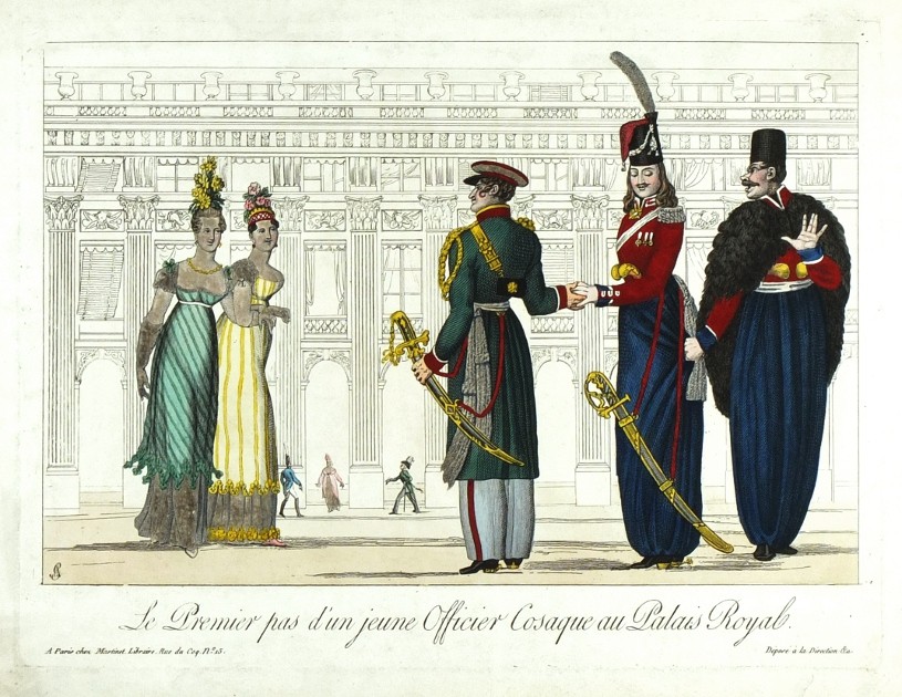 Godefroy, Adrien. "Le premier pas d'un jeune officier Cosaque au Palais Royal". Původní, staře kolorovaný lept. Vyd. A. Martinet v Paříži, 1814. 19,7:29,8 cm.