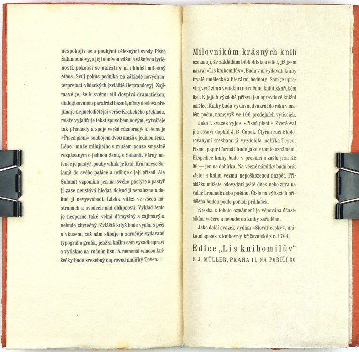 Tištěno jako reklamní prospekt nakladatelův k založení edice 'Lis knihomilův', ve které jako první svazek vyšla Píseň písní. - Velmi dobře zachováno.