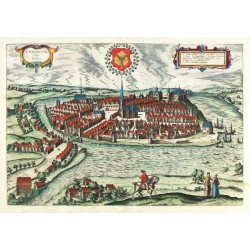 Kiel. "Chilonum, vulgo Kyell". Orig. Altkol. Kupferstich nach Braun & Hogenberg. Aus J. Janssonius "Theatrum praecipuarum urbium ... Europae ...", Amsterdam, Janssonis, 1657. 33:48 cm.