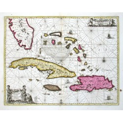 Antillen (Karibik). "Insularum Hispaniolae et Cubae Cum Insulis circum jacentibus accurata delineatio". Orig. copper-engravig, J. Janssonius. Original old colouring. Published by G. Valk & P. Schenk in Amsterdam, ca. 1690. With figure title-cartouche, ornamental...