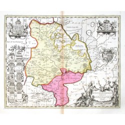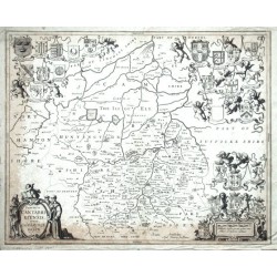 Huntingdonshire. "Huntingdonensis Comitatus Huntington Shire". Orig. copperplate engraving, P. Schenk and G. Valck, Amsterdam, ca. 1700. Orig. old colouring. With figure title-cartouche and 13 coats of arms (including one blank shield) held by cherubs. 39:48,5 cm.